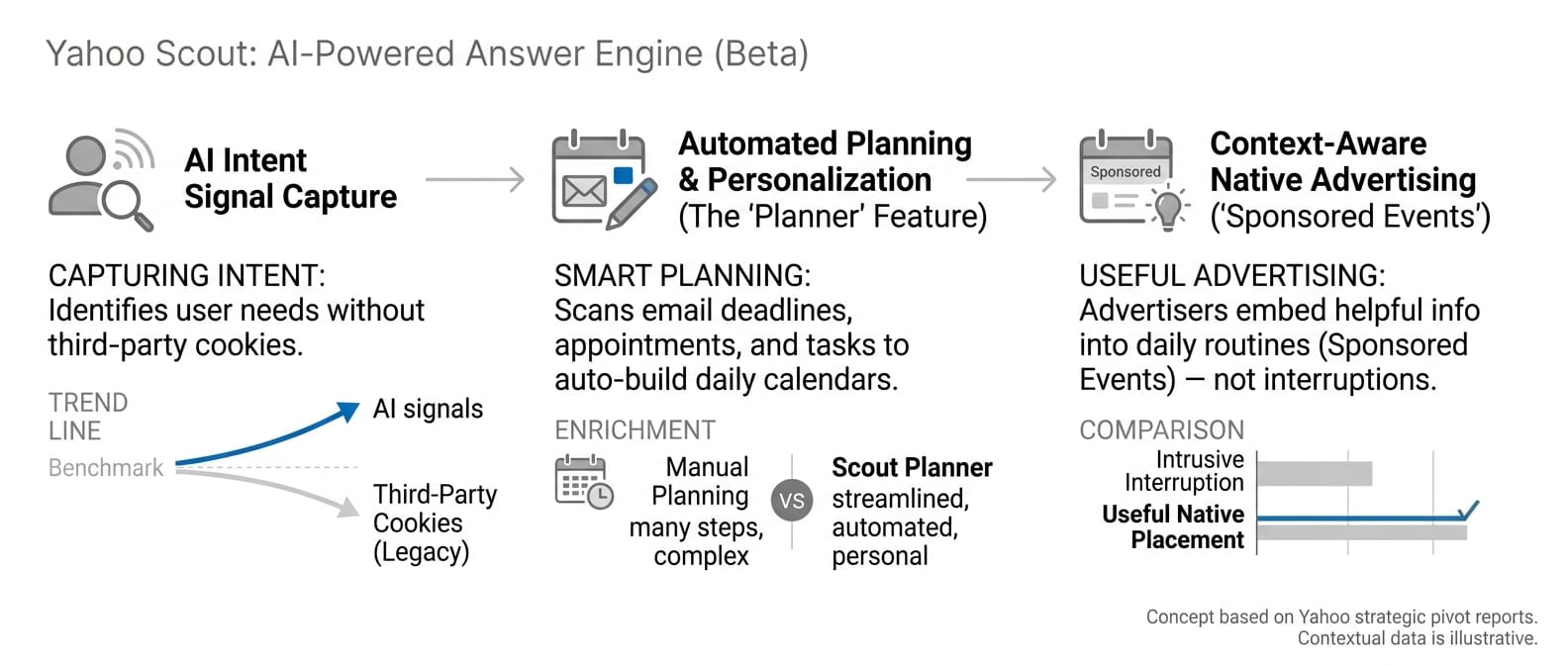 Powering the whole operation is Yahoo Scout, an AI answer engine in beta that pulls intent signals as third-party cookies vanish. A new feature called Planner scans Yahoo Mail for deadlines, appointments, and tasks, then auto-builds a calendar around them. Advertisers can embed themselves into that daily routine through Sponsored Events, so the ad becomes the useful thing instead of the interruption. The system represents Yahoo's strategic pivot into AI-powered personalization as traditional advertising targeting methods become obsolete.