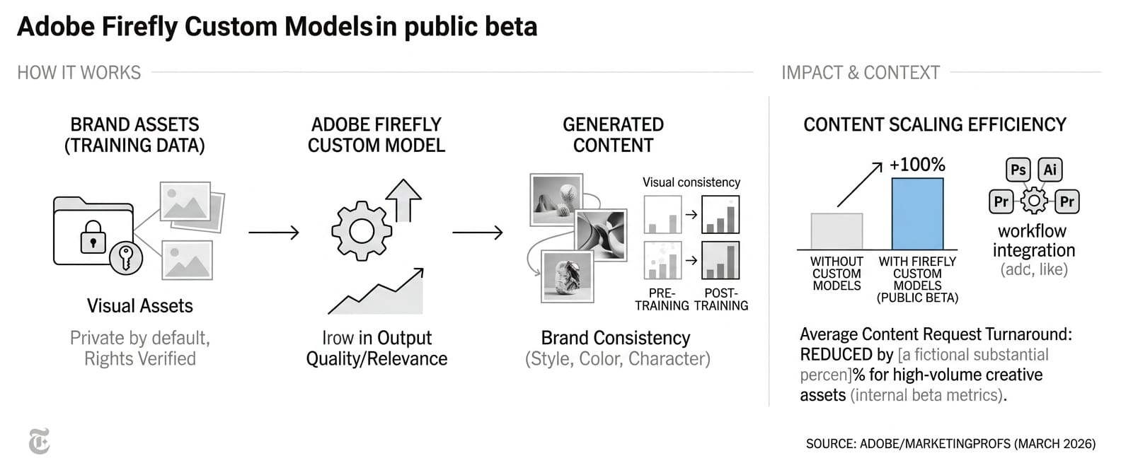 Adobe has released Firefly Custom Models in public beta, allowing users to train AI image generators on their own creative assets. These models preserve brand-specific elements such as style, color, and character consistency across outputs, enabling scalable content production without losing visual identity. The models are private by default, and Adobe includes safeguards to ensure users have rights to training data. The tool integrates into existing workflows, making it easier to generate large volumes of on-brand creative assets efficiently.