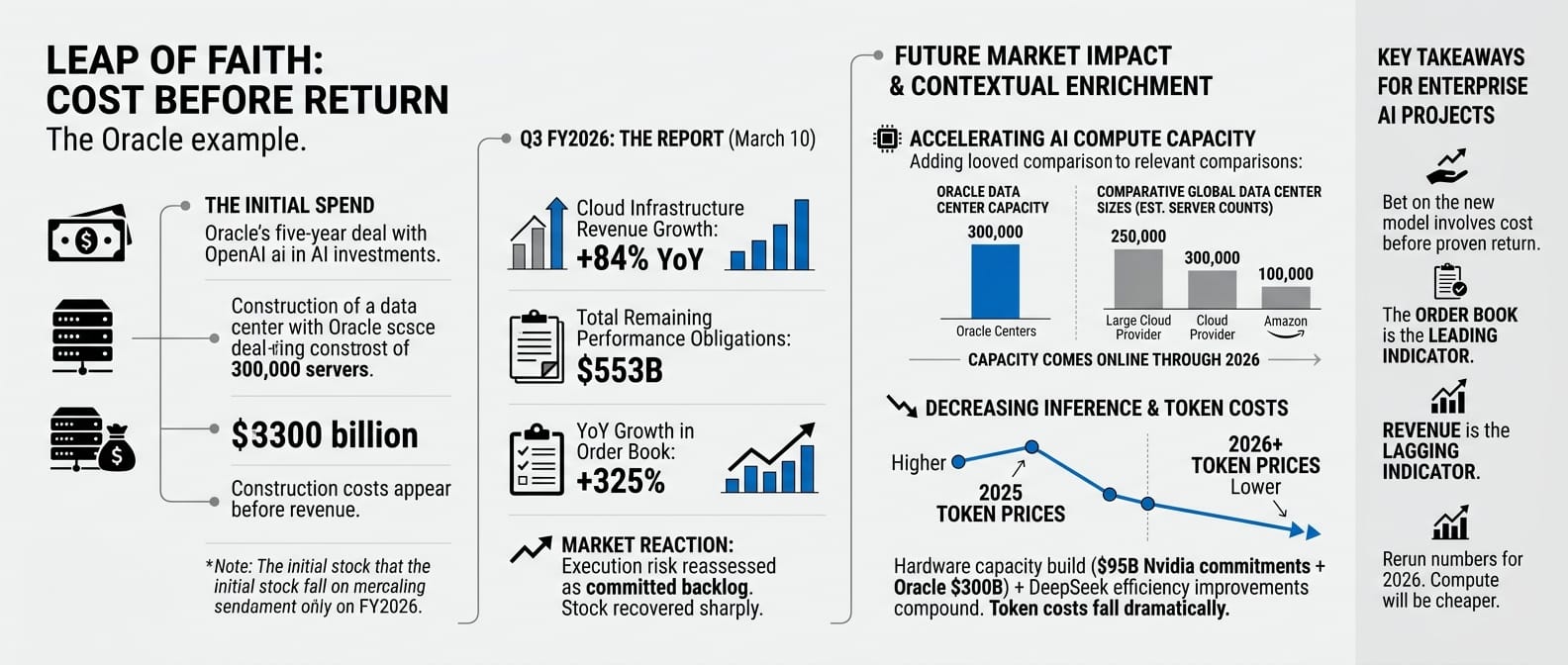 On March 10, Oracle reported. Cloud infrastructure revenue was up 84% year-on-year. The forward order book had reached $553 billion, up 325% from the prior year. The stock recovered sharply. What the market had read as execution risk was now readable as a committed backlog. The cost was real. The return was contracted and coming.