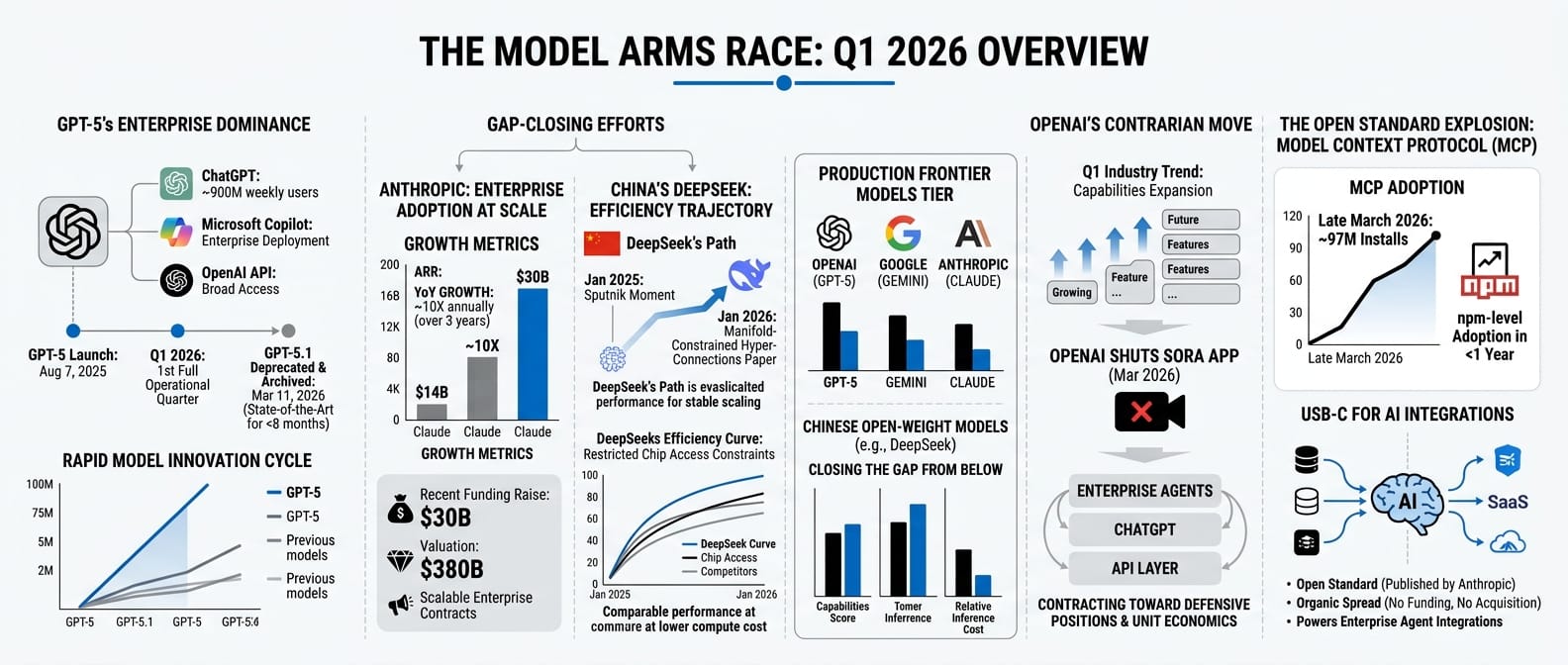 The Western AI industry's answer to Chinese efficiency was consistent throughout Q1: announce more spending. The $110 billion OpenAI raise, the $95 billion Nvidia supply commitments, the $300 billion Oracle build. Whether the compute moat thesis holds against a cost-efficiency thesis will not be visible in Q1 numbers. It will be visible in 2027.