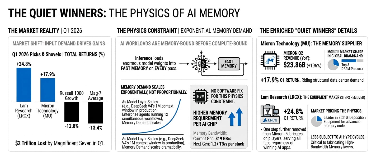 Lam Research makes the equipment used to manufacture the layers inside memory chips. It is one step further removed from the AI narrative than Micron. It is also, for precisely that reason, less subject to AI hype cycles. Lam's customers are the chip fabs, and the chip fabs are building regardless of which application layer wins. The +24.8% return in Q1 was the market pricing the physics.