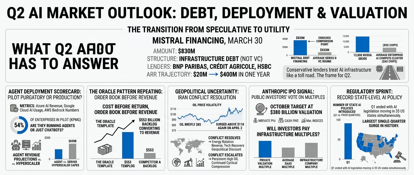 On the last trading day of Q1, Mistral announced $830 million in debt financing from BNP Paribas, Crédit Agricole, and HSBC. Not venture capital, not a Series D. Infrastructure debt. The same mechanism used to fund power plants, toll roads, and fibre networks. The banks were lending against structural demand for European-domiciled AI compute, driven by the EU AI Act, GDPR, and data residency requirements that many enterprise workloads cannot legally satisfy on US infrastructure. Mistral's ARR had grown from $20 million to $400 million in twelve months. Conservative lenders looked at that trajectory and called it a utility.