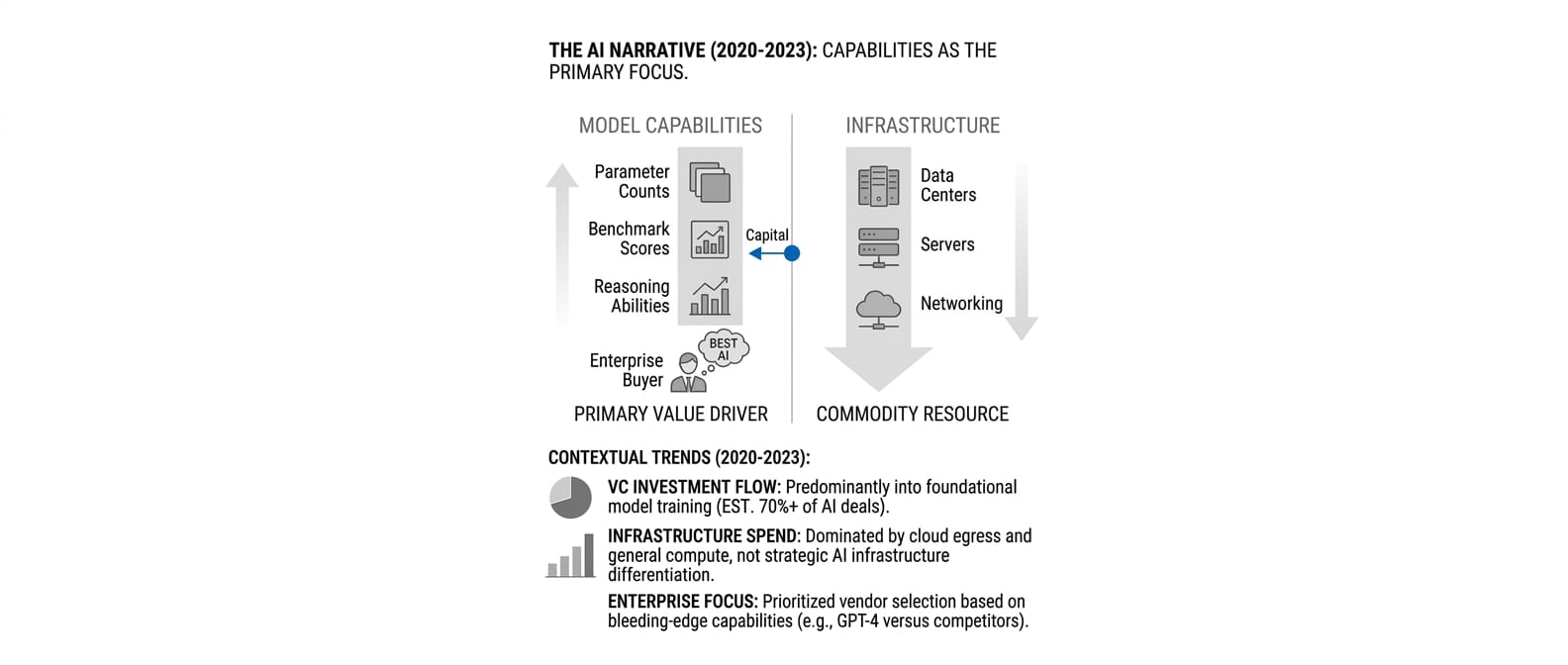 This seemed logical. Models were the scarce resource. Training required rare expertise, massive datasets, and cutting-edge research. Infrastructure was just servers and networking—available from established cloud providers. The assumption: whoever builds the smartest AI wins everything else.