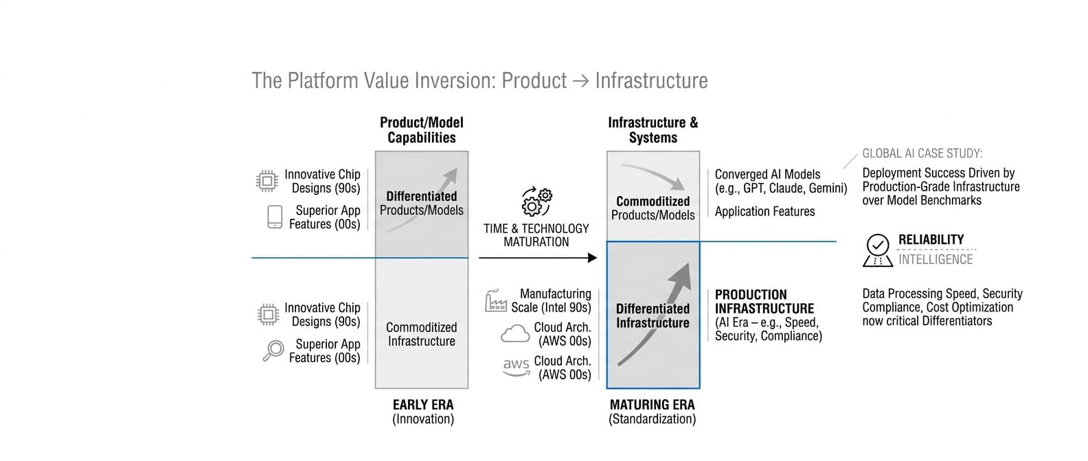 We saw this with Intel versus chip design companies in the 1990s. Everyone thought innovative chip architectures would win, but Intel's manufacturing infrastructure became the sustainable advantage. We saw it with Amazon Web Services versus hosting companies in the 2000s. Superior infrastructure architecture beat superior service features.
