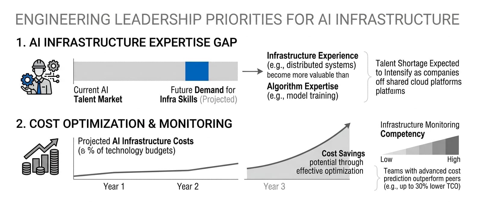 Implement infrastructure monitoring and cost optimization as core competencies. AI infrastructure costs will dominate technology budgets. Teams that master cost prediction, utilization optimization, and performance monitoring will deliver competitive advantages that pure model improvements cannot match.