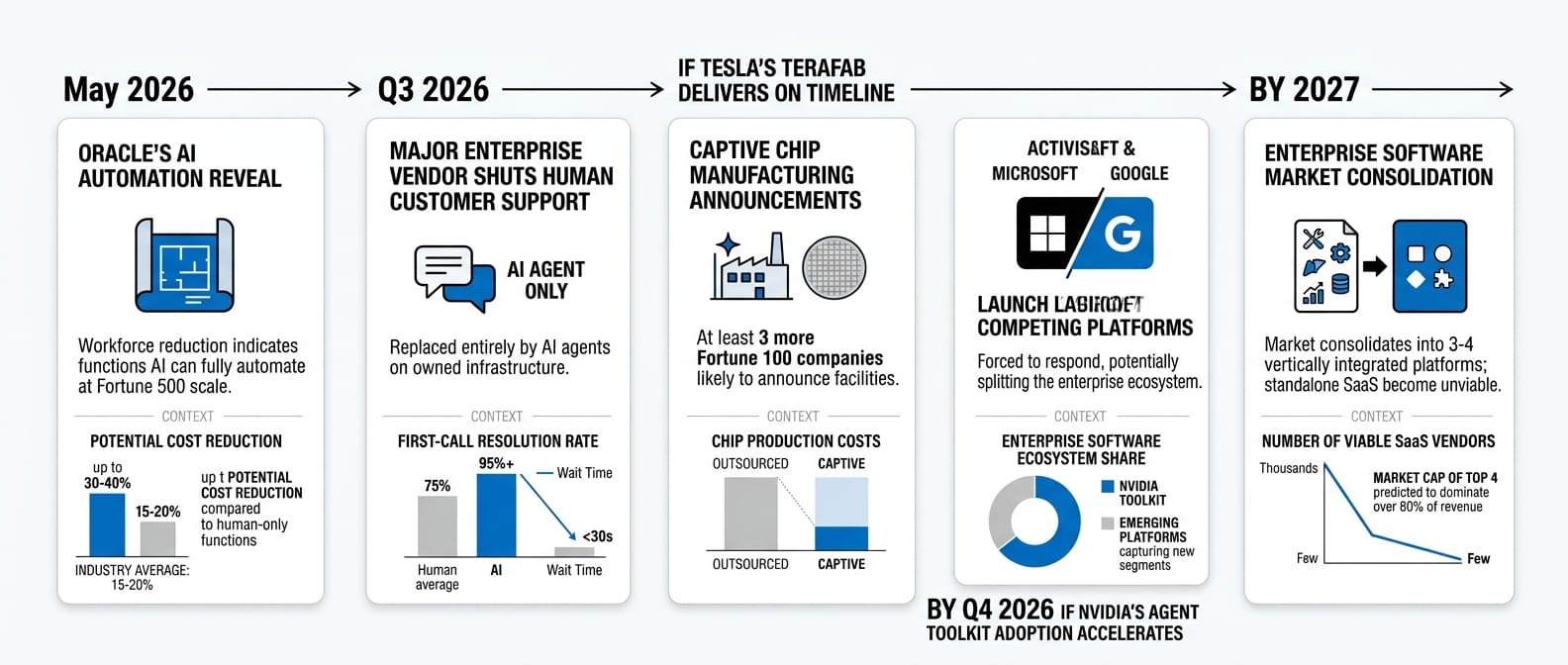By May 2026: Oracle's workforce reduction will reveal which enterprise functions AI can fully automate at Fortune 500 scale — creating a blueprint others will copy.