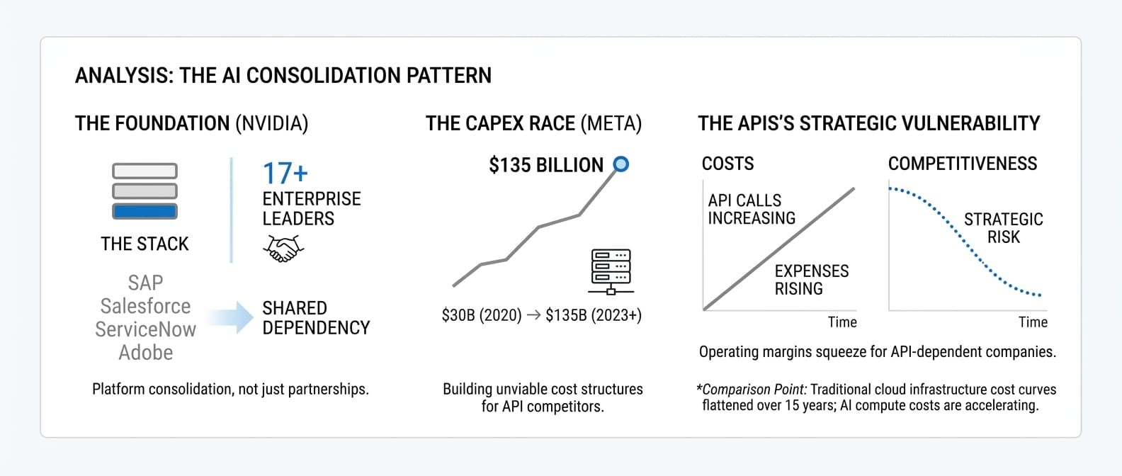 Now we're seeing the AI equivalent. NVIDIA's Agent Toolkit signing 17 enterprise software leaders isn't a partnership announcement. It's platform consolidation. Salesforce, SAP, ServiceNow, and Adobe are all building their next-generation products on NVIDIA's foundation, creating shared dependency.